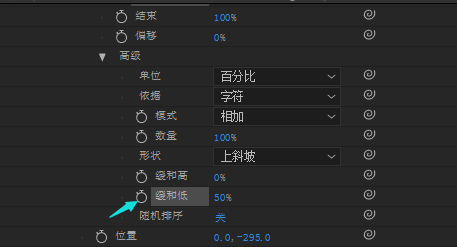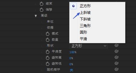 7、然后展開范圍選擇器,為了讓它的隨機性更隨機一點,這里是控制所有添加的動畫效果。點開形狀,可以選擇文字下落的方式,上斜坡的文字掉落方式可能會比較柔和一點。