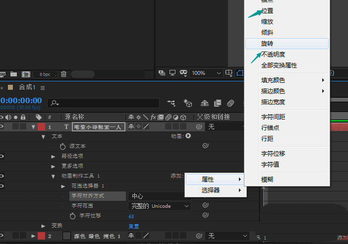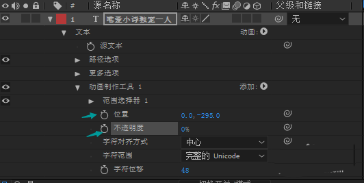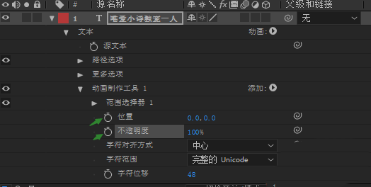 5、在點擊右邊的添加按鈕,添加兩個動畫,一個是位置,另一個是不透明度。這兩個屬性是用來控制圖層在畫布上的位置和圖層的不透明度。
