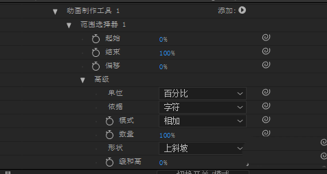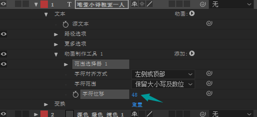 9、回到范圍選擇器制作動畫,把所有屬性都調(diào)回默認(rèn)值,開始為0%,結(jié)束為100%,偏移為0%。很多屬性都可以利用范圍選擇器來制作動畫。