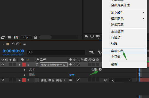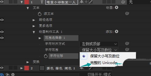 4、展開文字圖形屬性,點擊右邊的動畫,給文字添加一個字符位移。修改一下字符位移的參數(shù),數(shù)值越大,文字隨機偏移的效果就越劇烈,再把上方字符范圍修改為完整的字符。