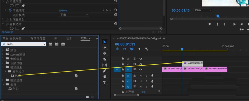 3、為了排除多余色彩,效果欄找到色彩拖過去