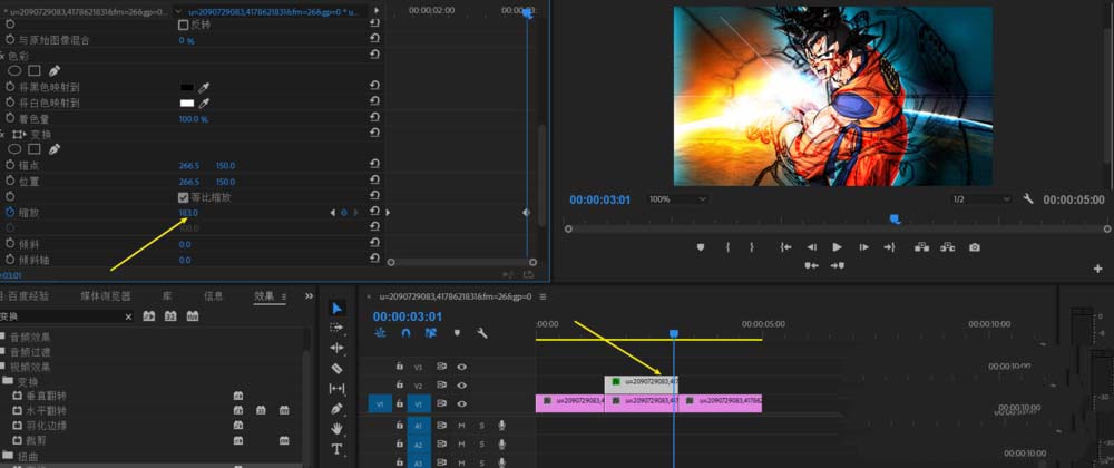 5、效果欄找到變換,拉過去