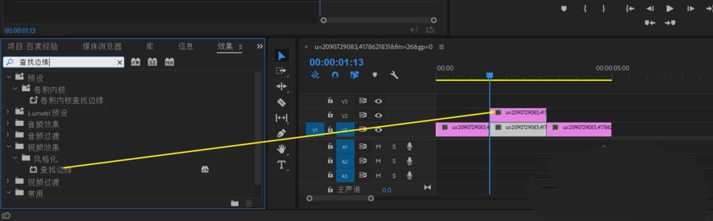 2、效果欄找到查找邊緣,使其出現描邊效果