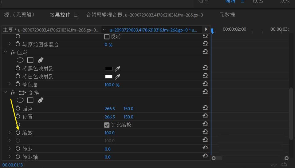 6、找到縮放,勾上關鍵幀,播放到這一段快要結束