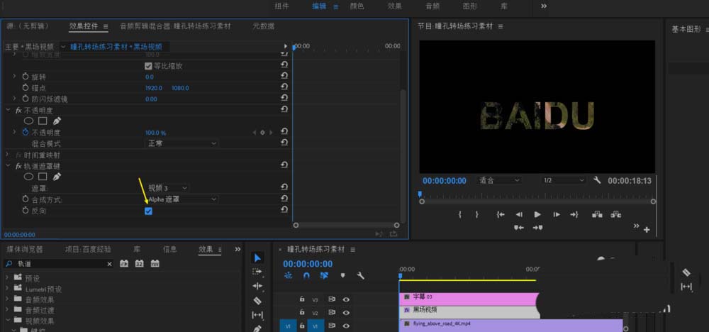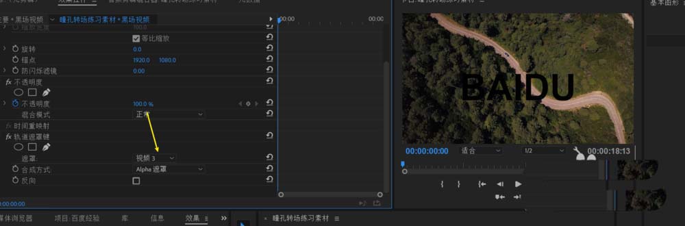 7、在左上角效果控件找到軌道遮罩,然后遮罩選擇視頻3