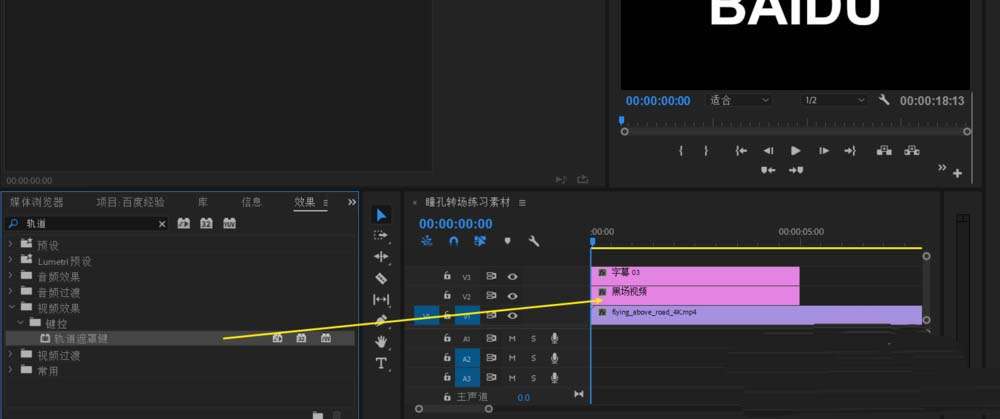 6、效果欄找到軌道遮罩,拉到黑邊視頻