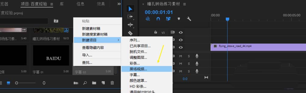 1、首先你得把你想剪輯的視頻先拉到時(shí)間軸,然后在項(xiàng)目的空白地方右鍵,選擇黑色的視頻