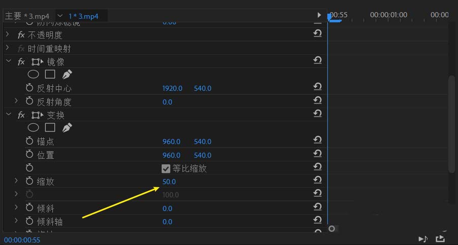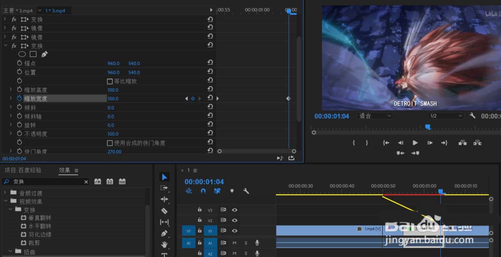 2、找到變換,拖到第一個切割塊上,找到左邊的控件,把等比縮放的勾去掉,順便把寬度打上關鍵幀