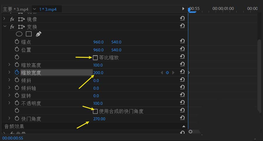 8、再把一個變換拉上去,把寬度改為兩百(勾上關鍵幀),記得把等比縮放去掉,快門角度跟剛剛一樣,往前九幀,過渡前一幀,把寬度改回100,大功告成!!