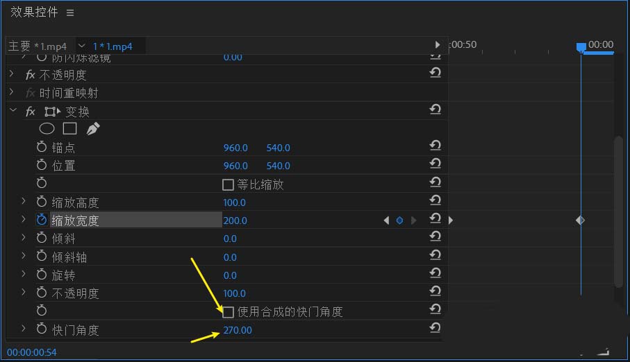 3、往右移動四幀,就是過渡出的前一幀,把寬改為200再把快門的勾去掉,數值改為270(拉伸的時候模糊感)目前為止已經達到第一個拉伸做完了
