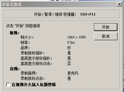 屏幕模式和音頻模式選擇之后點擊錄制,此時程序會很快完成初始化,初始化成功后會彈出此窗口,此時點擊開始或使用快鍵鍵Ctrl f11即可開始屏幕錄制