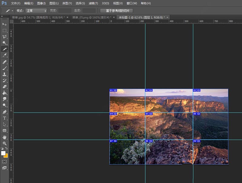 2、打開ps將一張素材圖片拉入,并且將圖片進(jìn)行切割;(也可以直接找?guī)讖埶夭膱D片,比如照片也行);導(dǎo)出切片;