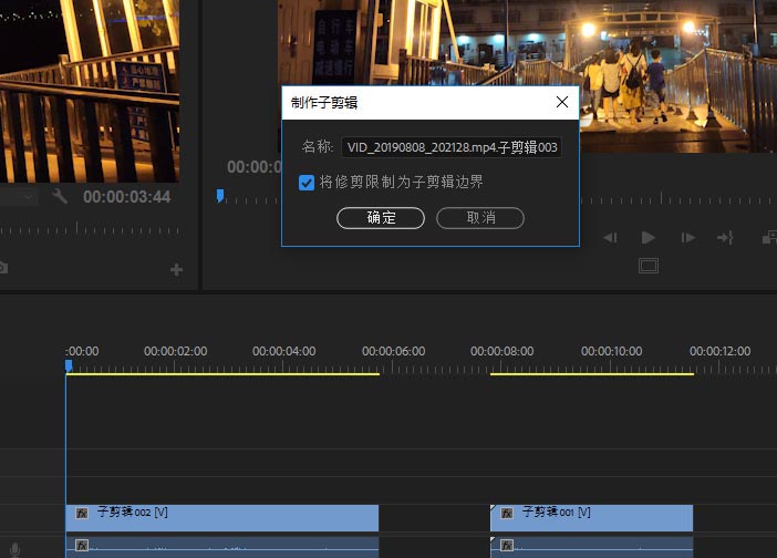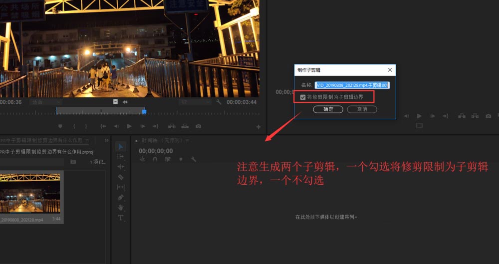 3、彈出制作子剪輯對(duì)話窗口,這里要生成兩個(gè)子剪輯素材,一個(gè)勾選“將修剪設(shè)置為子剪輯邊界”,一個(gè)不進(jìn)行勾選。