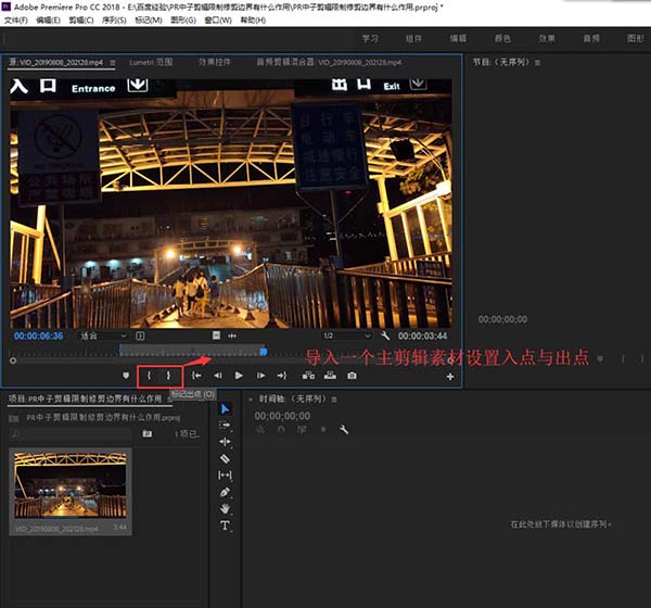 1、在PR中導(dǎo)入一個(gè)主剪輯視頻素材,然后雙擊預(yù)覽并設(shè)置子剪輯的入點(diǎn)位置與出點(diǎn)位置。