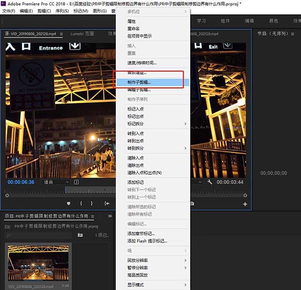 2、設(shè)置了出點(diǎn)與入點(diǎn)之后,在視頻素材媒體上右鍵鼠標(biāo),執(zhí)行“制作子剪輯”命令。