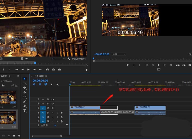 6、有三角形的就是勾選了將修剪限制為子剪輯邊界的,沒有三角形的就是沒有勾選,沒有勾選的沒有三角形的子剪輯素材我們可以拖動(dòng)延長(zhǎng)子剪輯素材時(shí)間。這就是兩者的區(qū)別。