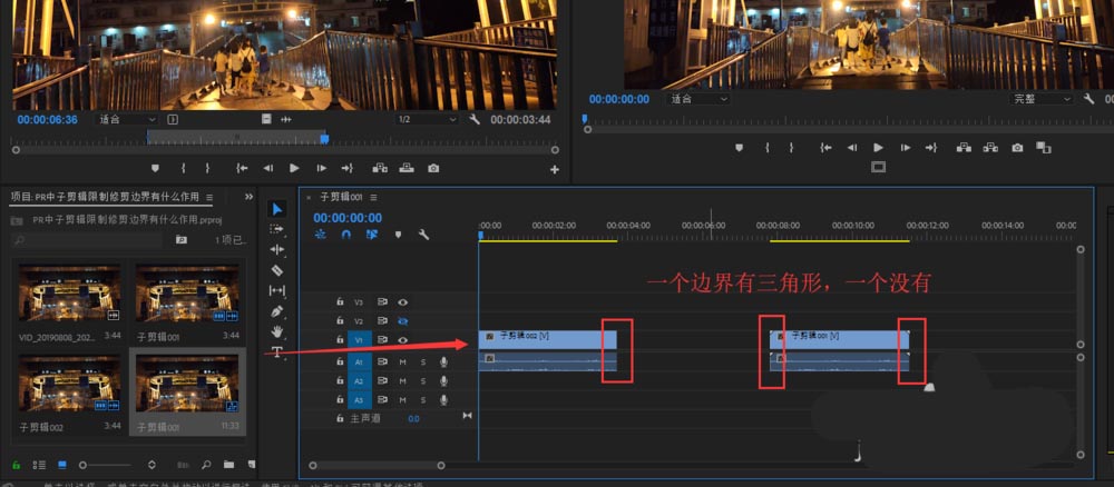 5、同時(shí)選中這兩個(gè)子剪輯素材,將這兩個(gè)子剪輯素材拖到時(shí)間軸窗口中生成序列,我們看到在視頻軌道的兩個(gè)子剪輯素材一個(gè)邊界有三角形,一個(gè)沒有。