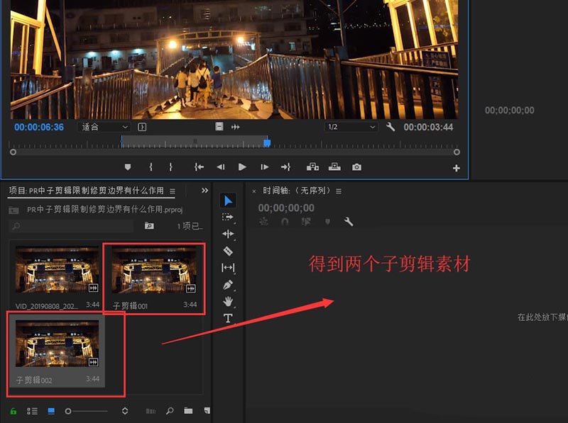 4、然后在PR的素材管理窗口中就會(huì)出現(xiàn)兩個(gè)子剪輯素材,分別是我們勾選將修剪設(shè)置為子剪輯邊界與不勾選的兩個(gè)子剪輯素材。
