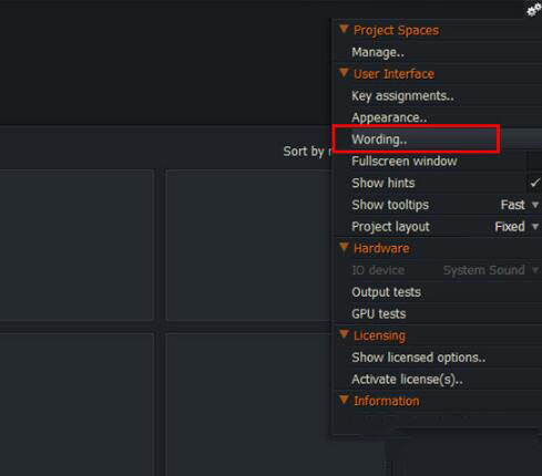 2、然后打開Lightworks,打開主程序,在右上角點(diǎn)擊齒輪,選擇其中的Wording選項(xiàng),如下圖所示: