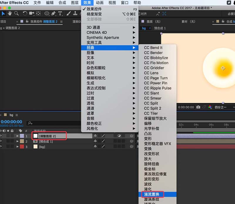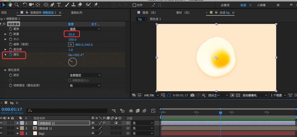 6、現在模擬雞蛋不規則形變,【效果】->【扭曲】->【湍流置換】。給演化K幀,適當調整數量(強度)。