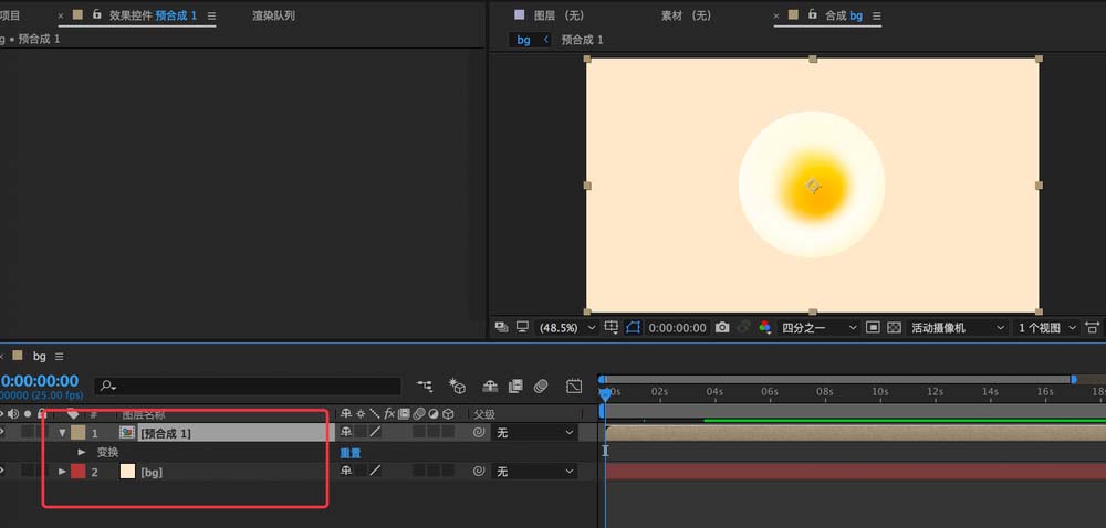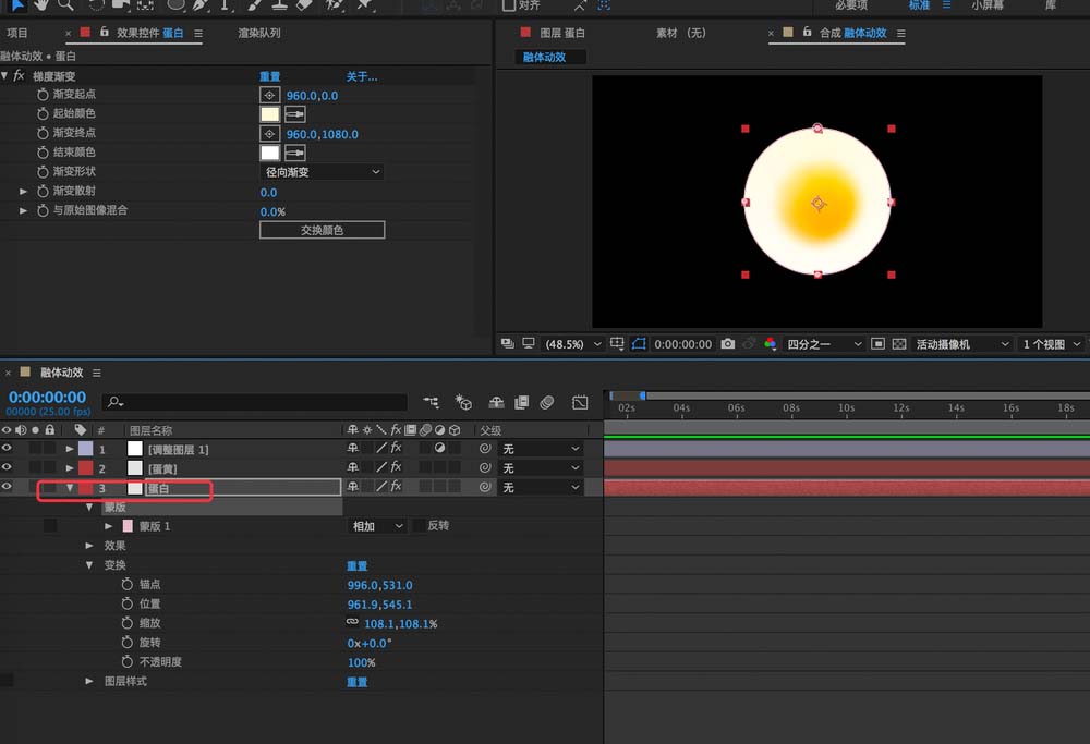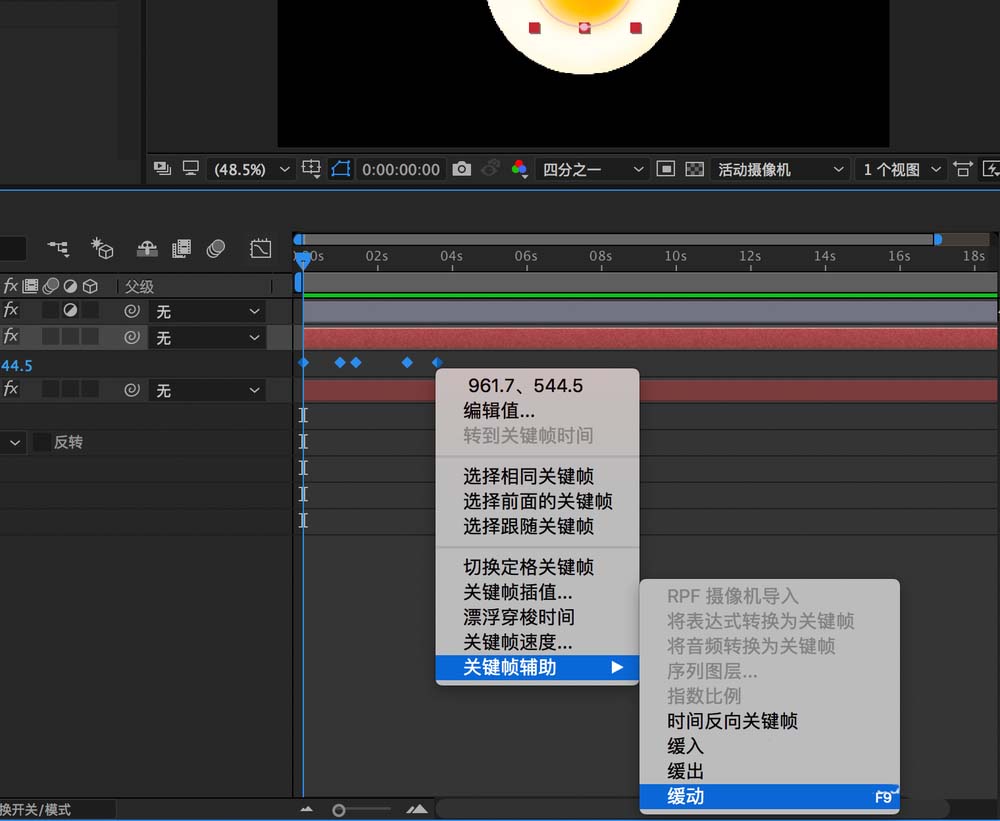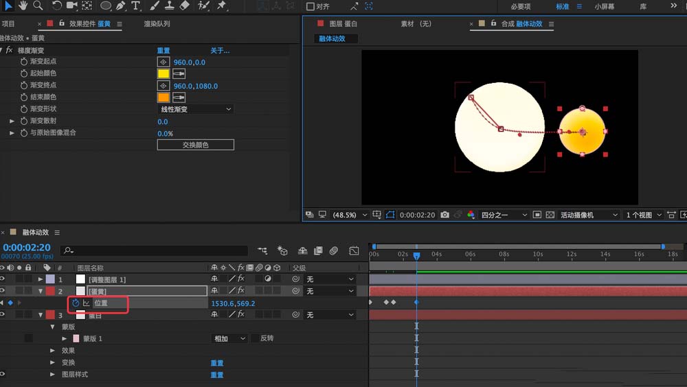 2、選中蛋黃,鍵盤P鍵,給蛋黃的位置K幀。