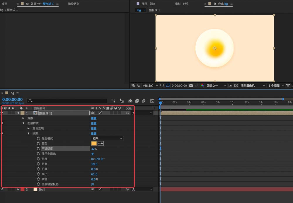 5、新建一個純色做背景層,設置以下顏色,給預合成添加【投影】。
