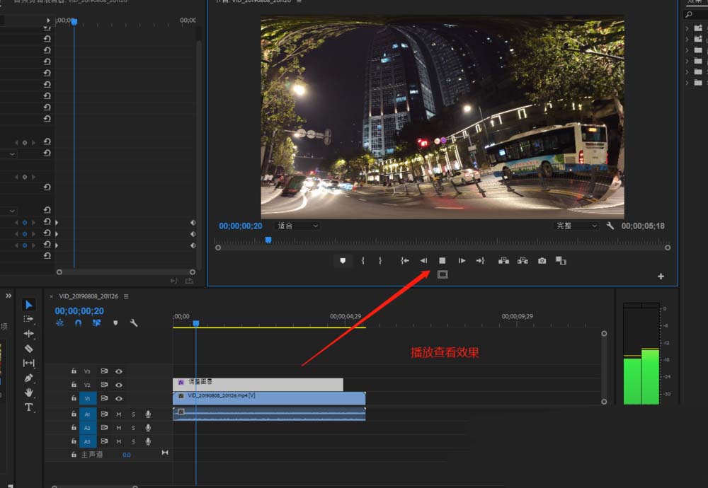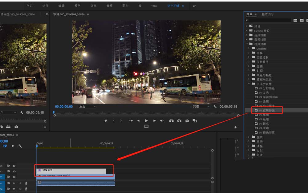 3、打開效果窗口,先點開視頻效果,在點開視頻效果中的沉浸式視頻,在沉浸式視頻效果類型中找到“VR旋轉球面”效果。施加于調整圖層。