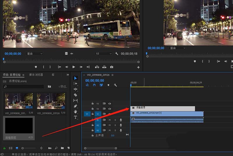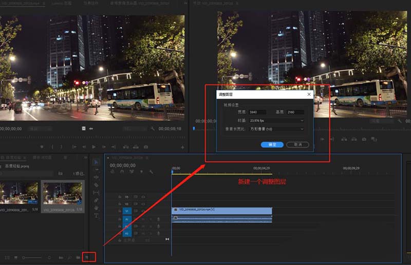 2、創建一個和序列大小一致的調整圖層,然后選擇創建的調整圖層將其放到對應的時間軸視頻軌道。