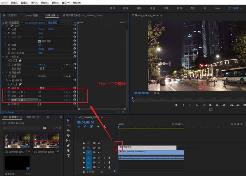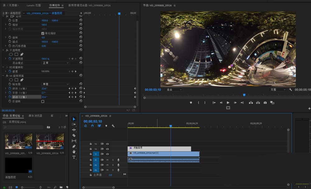 4、選擇調整圖層,打開效果控件窗口,找到VR旋轉球面效果,在VR旋轉球面的傾斜、平移和滾動三個效果參數上各打入關鍵幀。