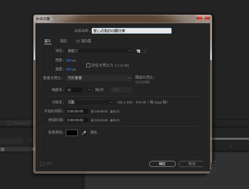 1、打開AE軟件,ctrl+n新建畫布,命名愛心點亮的動畫效果,調整相應的參數(shù)。