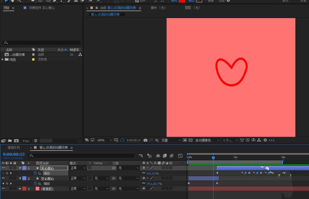 5、給空心的愛心的縮放屬性k關鍵幀,從無到有,0-100;然后給實心的愛心的縮放屬性也k關鍵幀,從無到有,0-100;調整時間線實心愛心在空心愛心之后出現(xiàn),為了讓實心愛心的效果更佳自然,我們給縮放做一個回彈的效果;