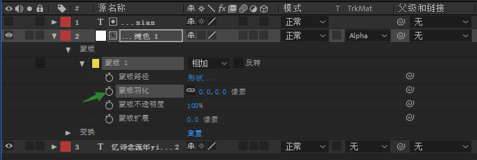 7、最后在純色圖層的屬性里面找到蒙版羽化,修改一下數值,讓光的邊緣更加柔和一些,這樣我們就做好了掃描文字光效的動畫。