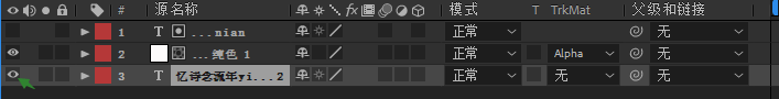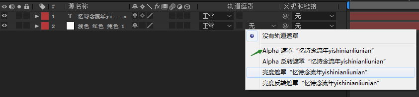5、接著,我們把純色圖層放到文字圖層的下方,點擊下方第二個圖標展開“轉換控制”窗格,然后在右方軌道蒙版的屬性上選擇Alha遮罩,這樣上方的文字圖層就被復制到了白色的位移動畫上面。