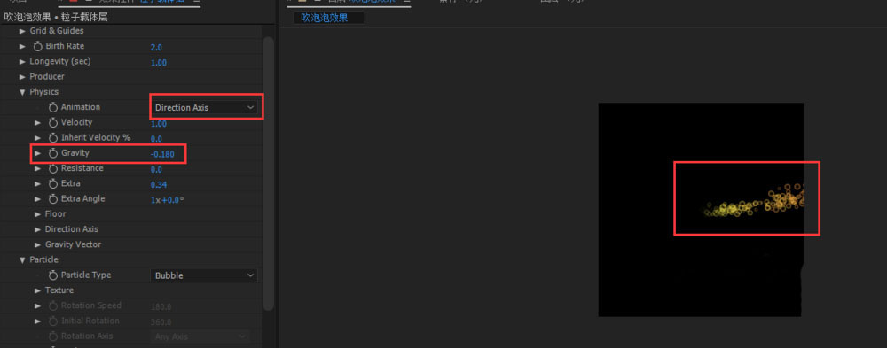 5、我們粒子類型(Particle Type)更改為泡泡(Bubble),你也可以根據自己的喜好嘗試其他類型。我們這里將物理性動畫參數(Animation),設定為:方向坐標(Direction Axis)。我們進一步調整物理重力參數(Gravity),使粒子產生向上飄動的效果。