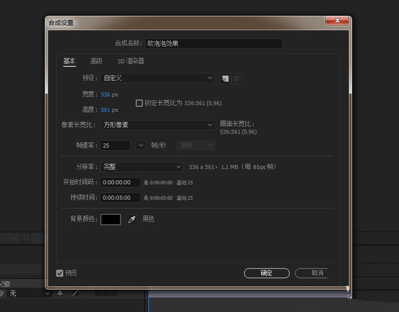 1、打開AE軟件,命名吹泡泡效果,調整相應的參數。