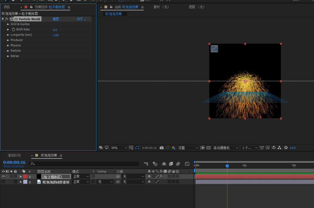 4、選中載體層添加CC Particle World效果;效果-模擬-CC Particle World,按下空格鍵就可以看到默認的粒子效果是怎么樣的了。