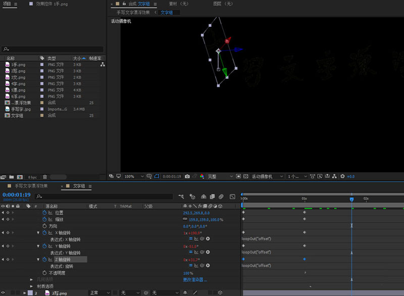 8、同理y軸和z軸也是這樣操作,預覽就可以看到效果了,我們只需要再給p位置k關鍵幀就好了(旋轉操作隨意,看起來舒服就好);剩下的文字同理操作就好,為了讓他們不是在同一個時間點出現,我們需要把所有文字的顯示時間錯開;