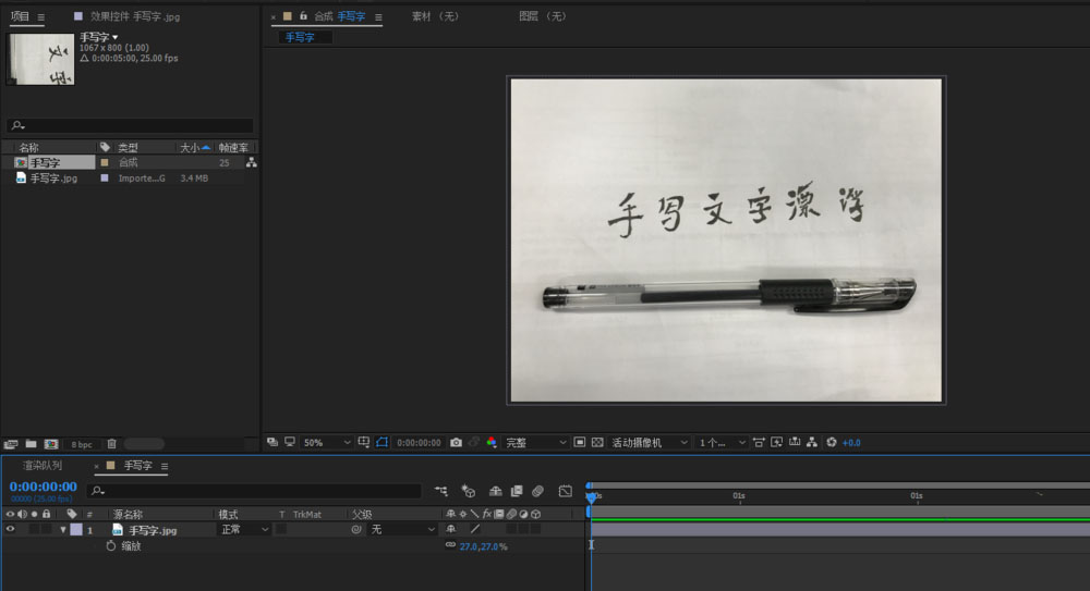 2、ctrl+i把我們事先準備好的手寫字素材導入進來,并拉入時間線面板內;