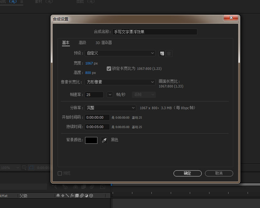 1、打開AE軟件,命名手寫文字漂浮效果,調整相應的參數。