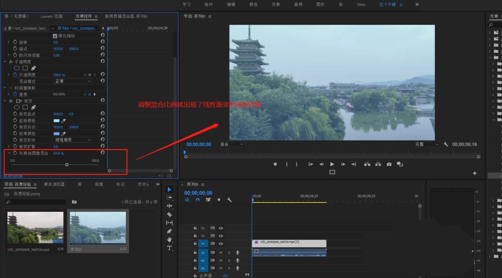 6、更改“與原始圖像混合”的參數,得到線性漸變顏色與原始視頻混合的效果,這樣就會出現線性漸變的濾鏡調色效果。