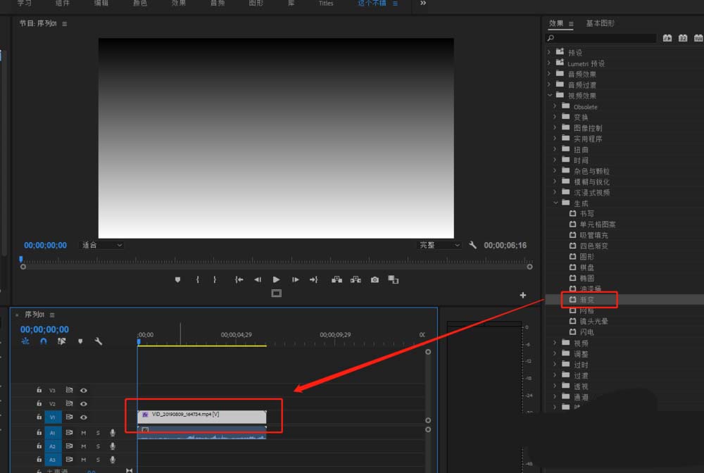 3、直接找到“漸變”視頻效果,將漸變視頻效果添加應用到視頻軌道的視頻素材媒體上。