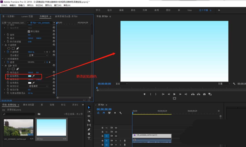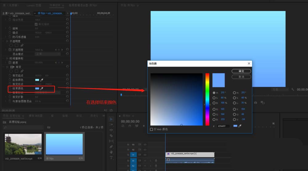 4、選中視頻素材媒體,打開效果控件找到“漸變”設置,先來設置起始顏色的顏色,這里根據你的喜好選擇一個顏色。