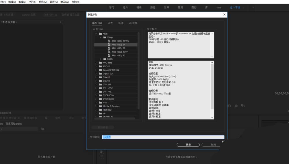 1、在一個PR項目中,選擇新建一個序列,這里可以選擇預設序列,也可以自定義序列設置。