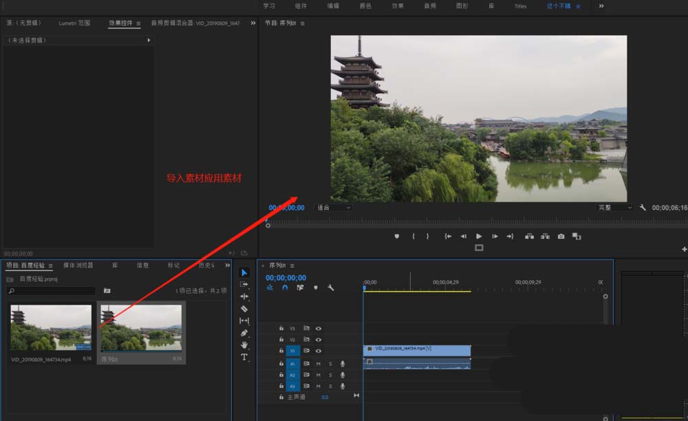 2、導入視頻素材,并將視頻素材應用到序列的時間軸對應的視頻軌道。