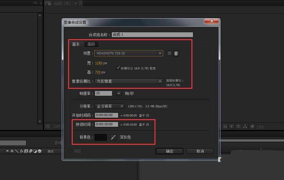 1、首先就是新建合適尺寸的合成,在這里我們選擇720P的高清模式,持續時間是10秒。