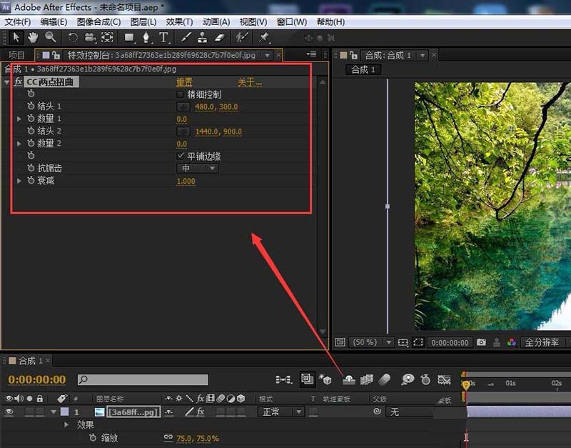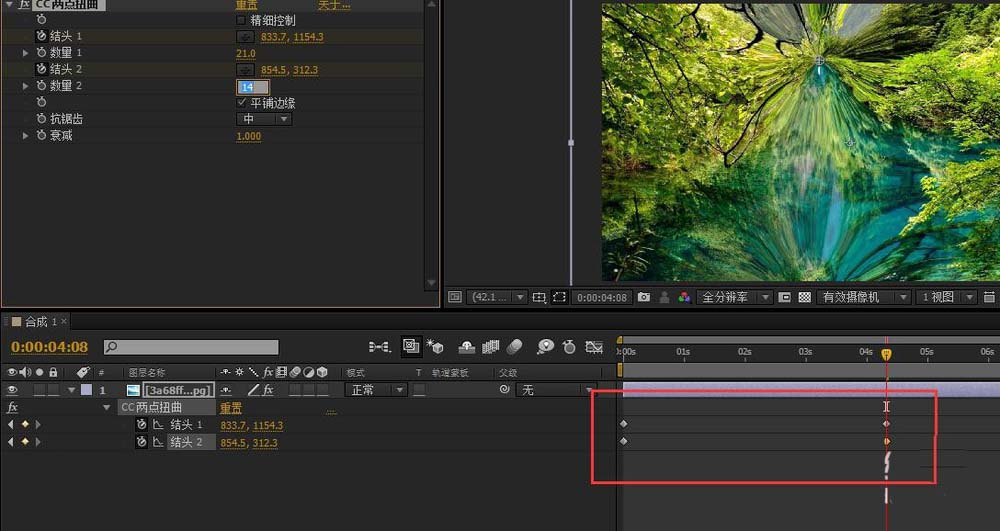 5、在左上角打開"特效控制臺",可以看到“CC兩點扭曲”的特效已經被添加完成。