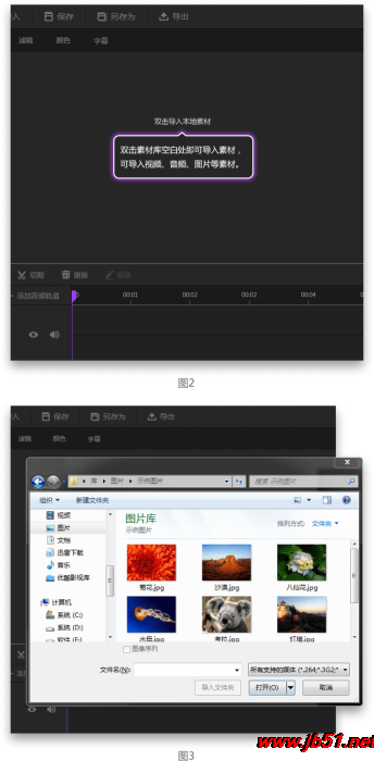 雙擊素材庫(kù)空白處即可導(dǎo)入素材至素材庫(kù),如圖2。軟件會(huì)彈出文件選擇框,選擇需要導(dǎo)入的文件后點(diǎn)擊確認(rèn)按鈕即可導(dǎo)入,如圖3。并且可導(dǎo)入各種常見(jiàn)格式的視頻、音頻、圖片等素材。