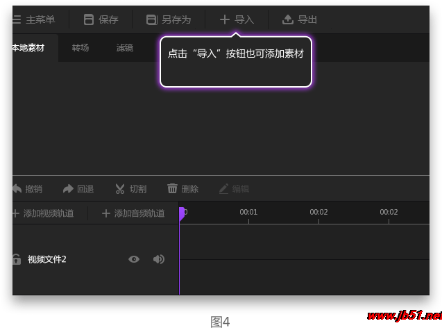 除了雙擊素材庫(kù)空白處導(dǎo)入素材的方法,還有通過(guò)點(diǎn)擊菜單欄的導(dǎo)入按鈕可以導(dǎo)入素材