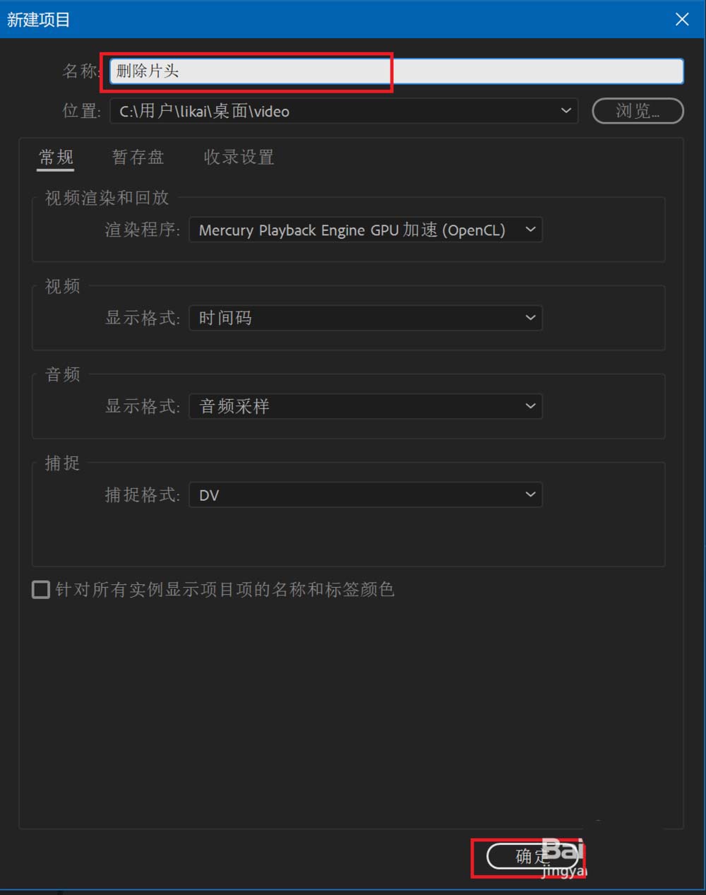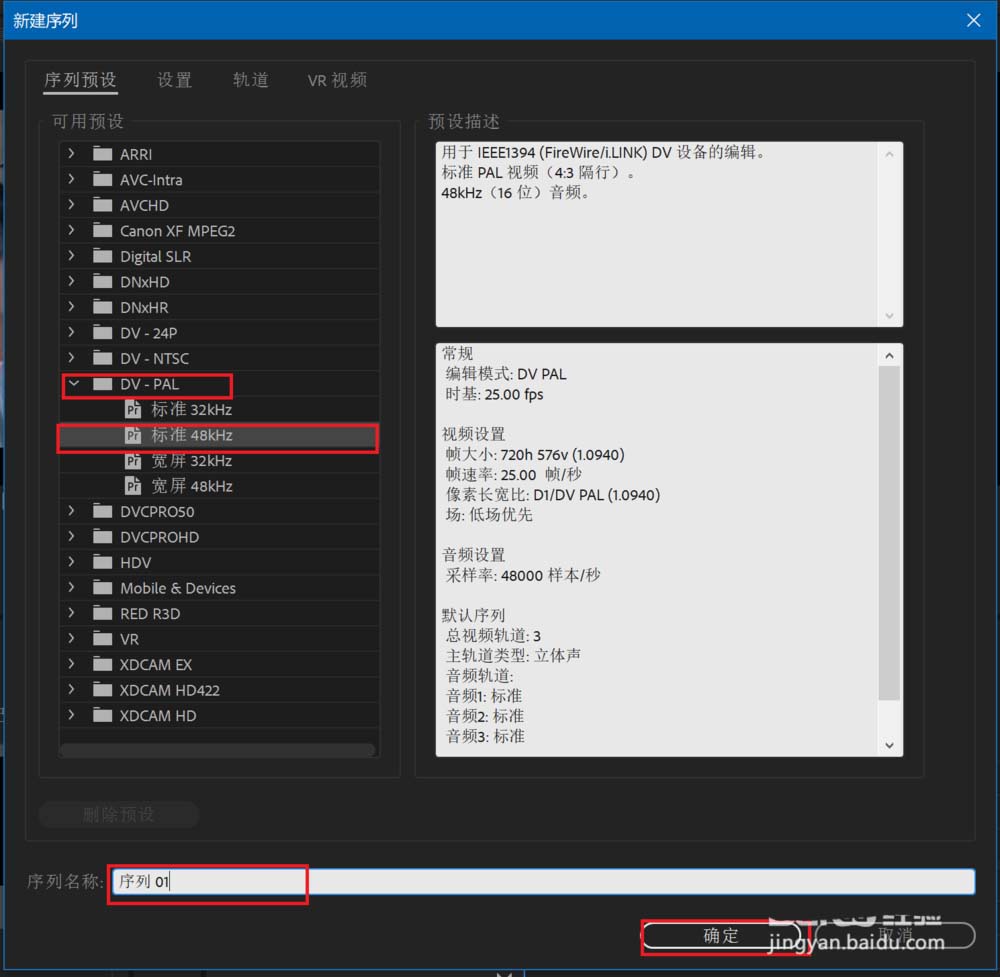 8、按下圖紅框所示的設置創建序列,填寫序列名后點擊確定。