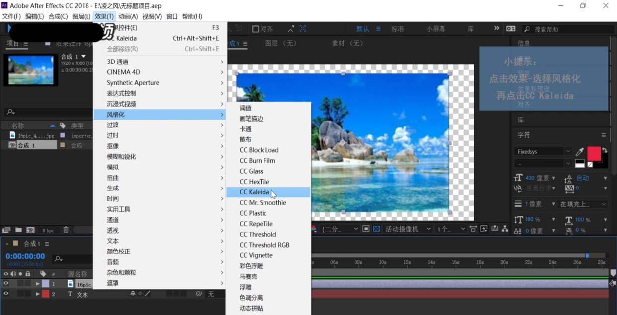 1、 選中圖片,點擊菜單欄上方的“效果”再選擇“風格化”再選擇“CC Kaleida”